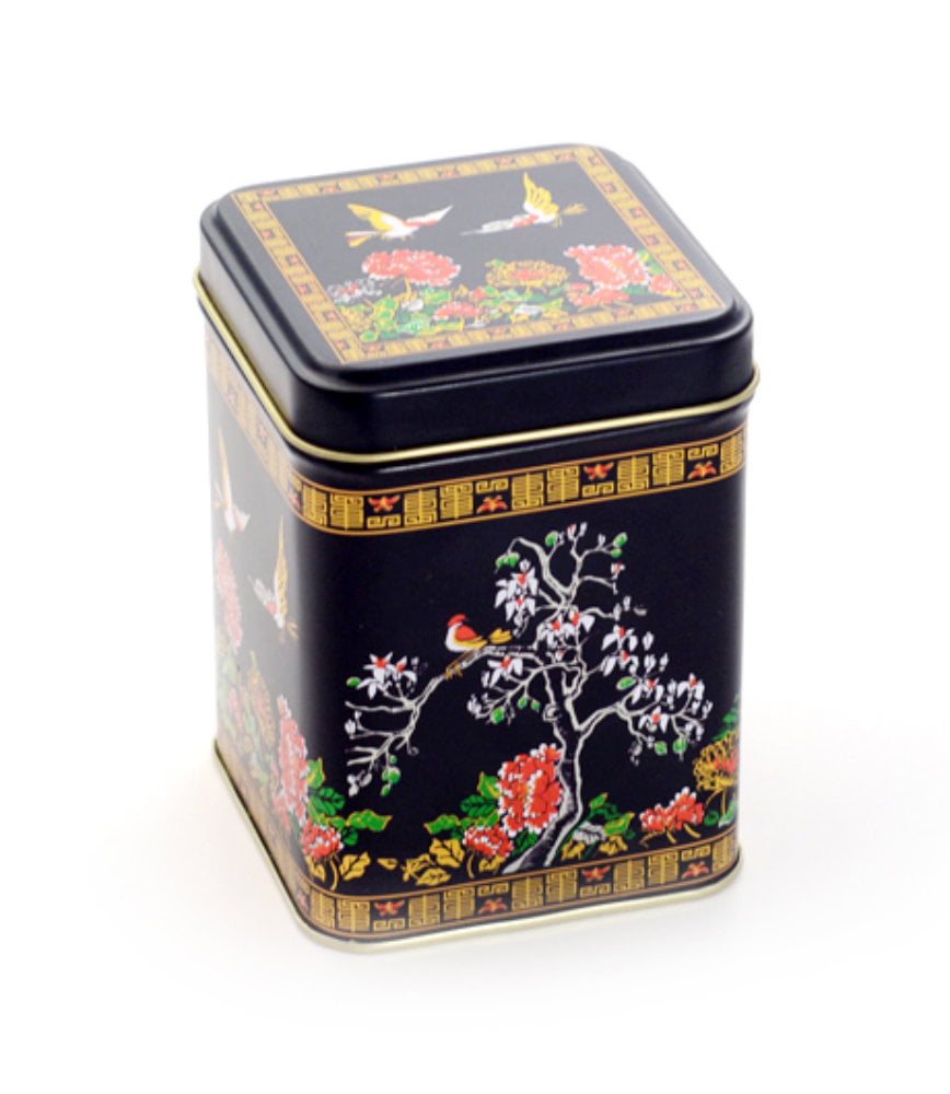 The Magnolia Tin is a small square tin and has a black background with a oriental design. It holds approximately 100g of most teas.